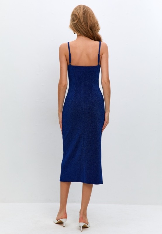 Платье облегающего силуэта с изящным вырезом. Модель, которая приковывает взгляды. Главным акцентом является фигурный вырез с драпировкой на лифе и вырез над талией. С помощью регулируемых бретелей платье можно корректировать под свой рост. Без застежки. Материал - эластичный трикотаж с люрексом.