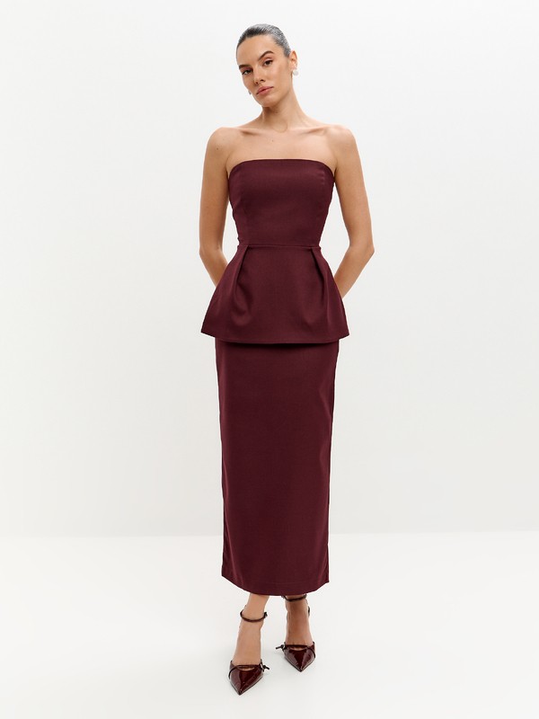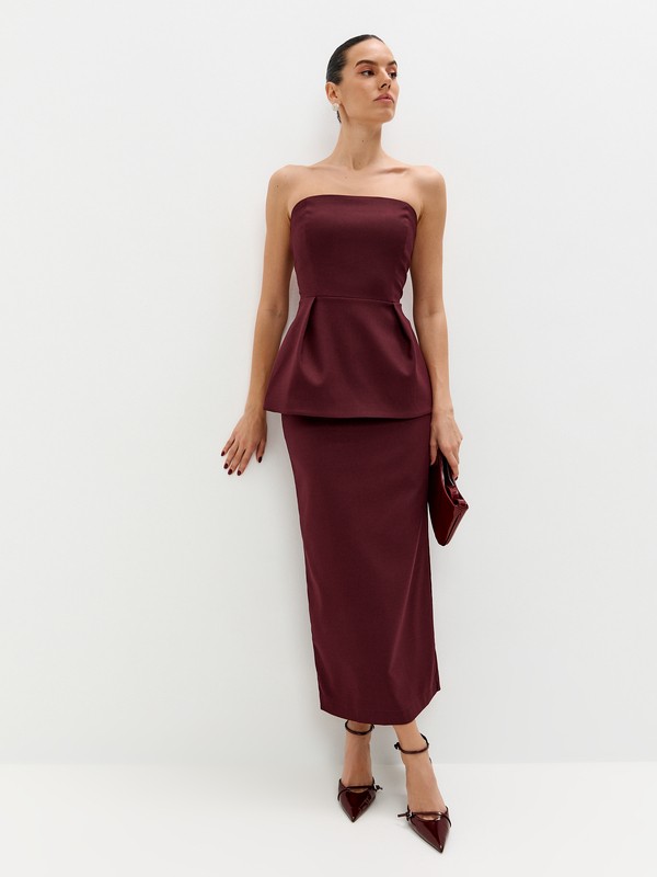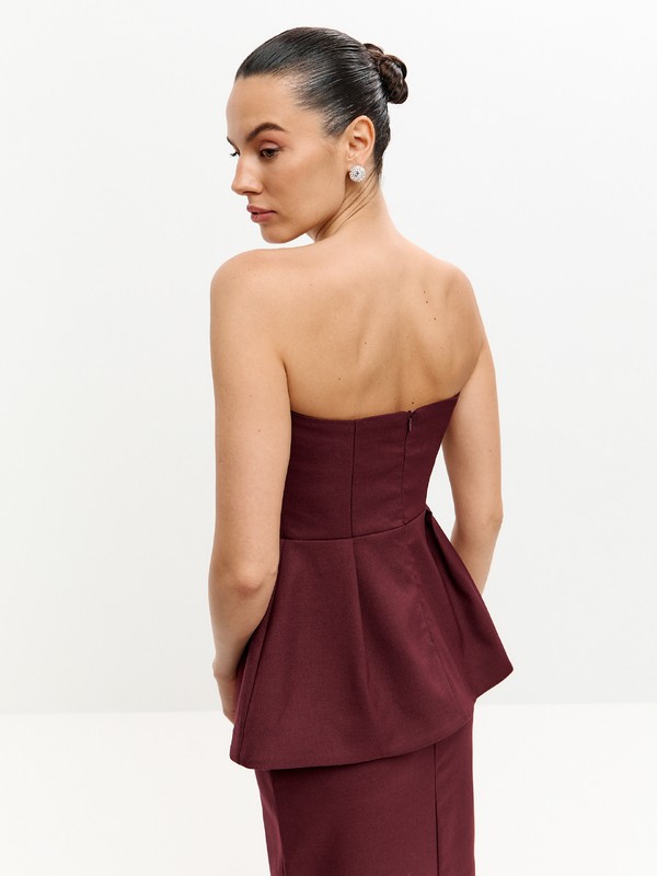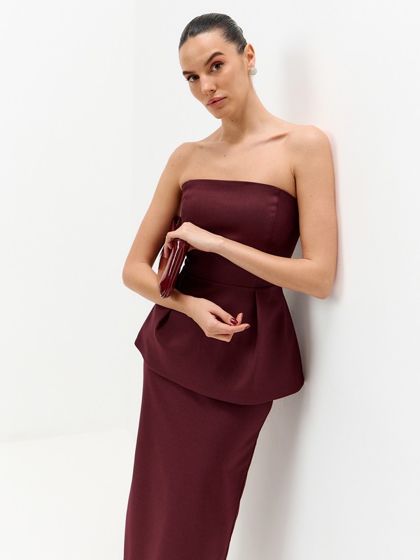 Топ-корсет с широкой баской и акцентами на бедра, силуэтом напоминающий изящный цветок. Идеальное решение для вечернего образа. Застежка на потайную молнию. В комплект к корсету представлены юбки в тон, в повседневных образах смело сечетайте корсет с базовыми джинсами из своего гардероба или выбирайте брюки в коллекции Suara femme.